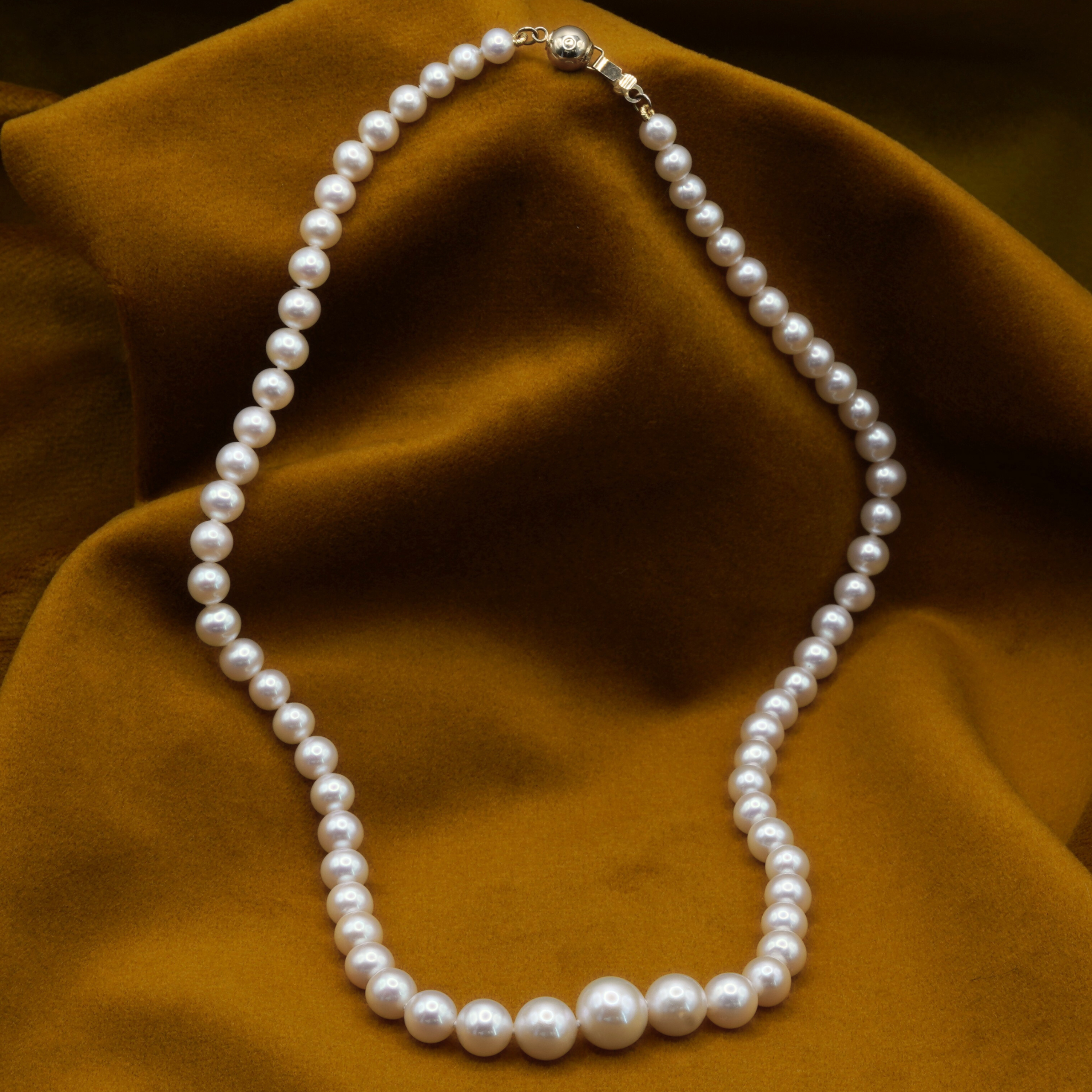 Elegancki, ponadczasowy naszyjnik z pereł słodkowodnych, nanizanych narastająco. Całość dopełnia ozdobne, zapięcie ze złota w kształcie kuleczki, które stanowi nie tylko praktyczny element, ale również elegancki detal biżuteryjny. Dzięki niemu naszyjnik prezentuje się stylowo , a jego zapinanie i rozpinanie jest bardzo wygodne i bezpieczne.
