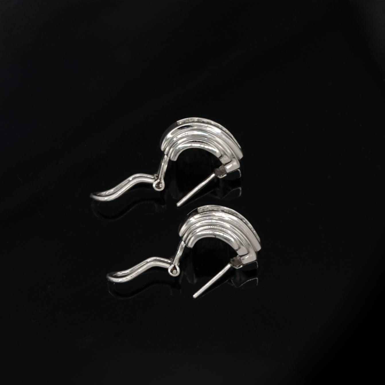 Kolczyki wykonane z białego złota z wyrazistą, geometryczną linią podkreślającą ich luksusowy charakter. Centralnym elementem kompozycji jest pas precyzyjnie osadzonych diamentów w szlifie bagietowym. Smukłe, prostokątne kamienie ułożone w równym rzędzie tworzą efekt świetlistej tafli, która subtelnie odbija światło. Gładko polerowana powierzchnia białego złota stanowi eleganckie tło dla diamentów, potęgując ich czystość i połysk. Kolczyki mają harmonijną, lekko zaokrągloną formę, dzięki czemu pięknie układają się na uchu i zapewniają komfort noszenia. To klasyka w nowoczesnym wydaniu.