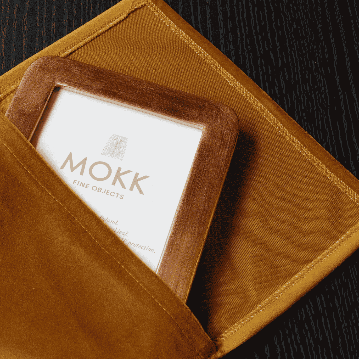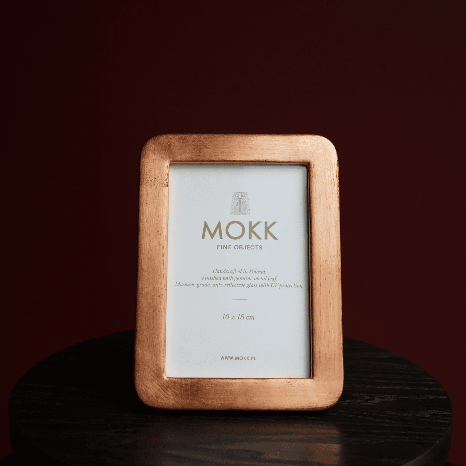 Ręcznie wykonana ramka fotograficzna wykładana płatkami miedzi. Wyposażona w muzealne szkło antyrefleksyjne z filtrem UV, które chroni zdjęcia przed blaknięciem i zapewnia doskonałą widoczność. Elegancka forma, szlachetne materiały oraz estetyczne odwrocie sprawiają, że ramka doskonale nadaje się do ekspozycji fotografii. Do ramki dołączone etui welurowe.